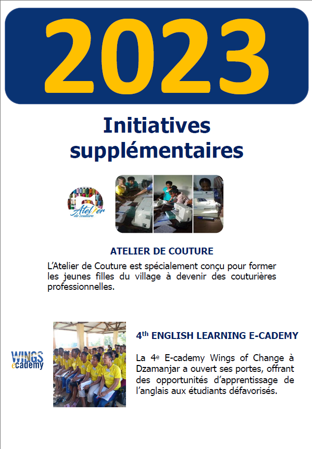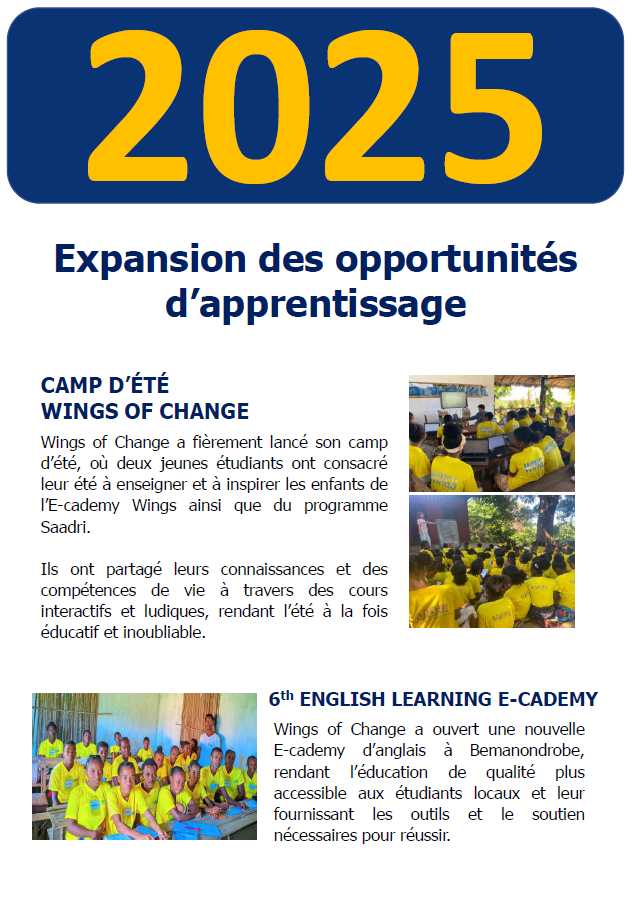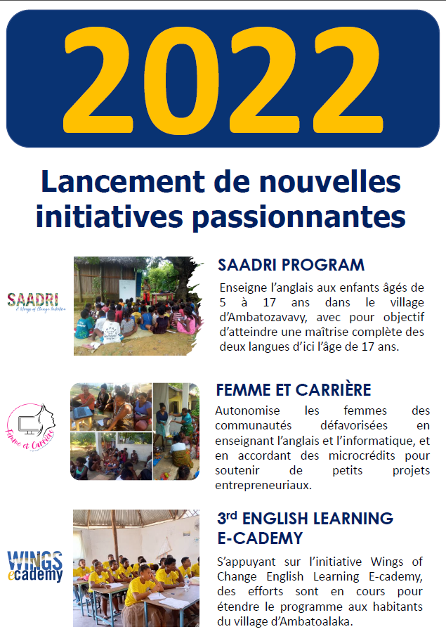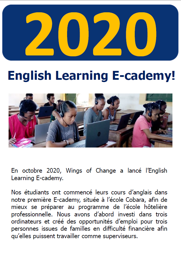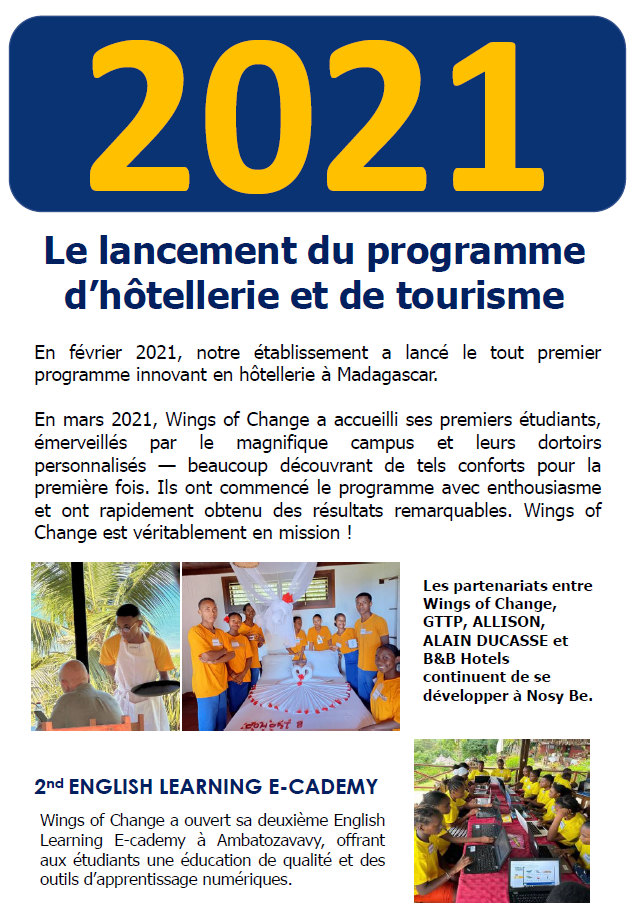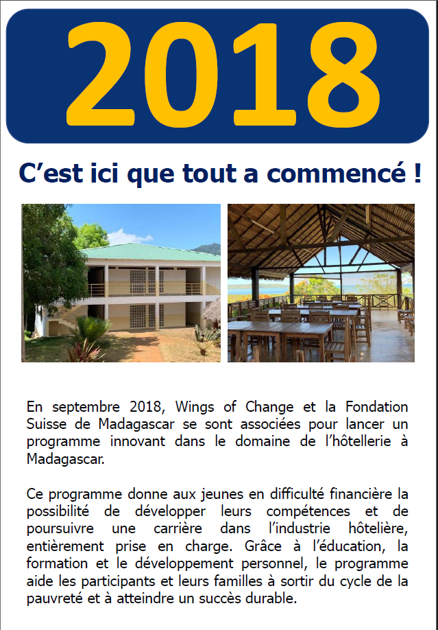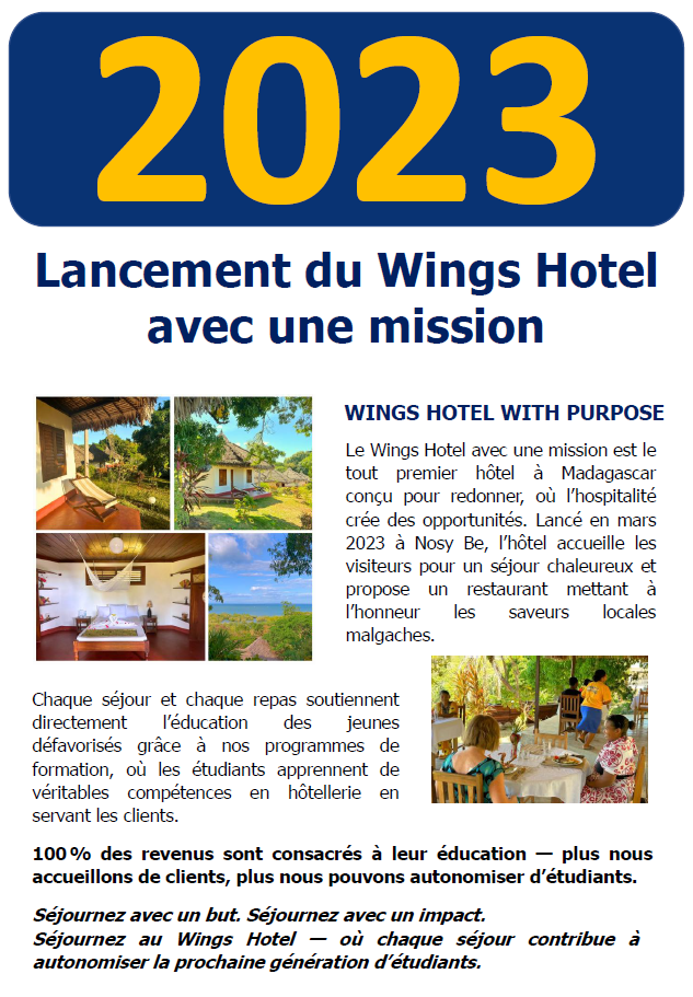 L'Association Wings of Change est une organisation à but non lucratif établie à Nosy Be, Madagascar. Elle a fondé une école hôtelière professionnelle destinée à offrir à des étudiants en difficulté financière une formation théorique et pratique dans les domaines de l’hôtellerie, du développement touristique et des langues étrangères.